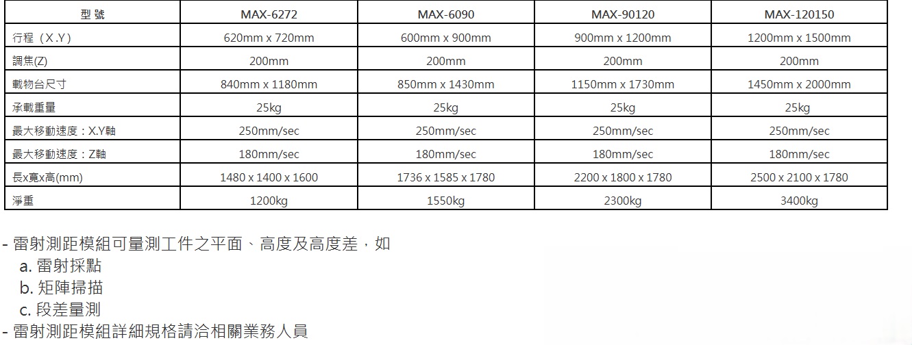- 線性精度 X、Y 軸 (5+L/100 ) μm (MAX-90120、MAX-120150)